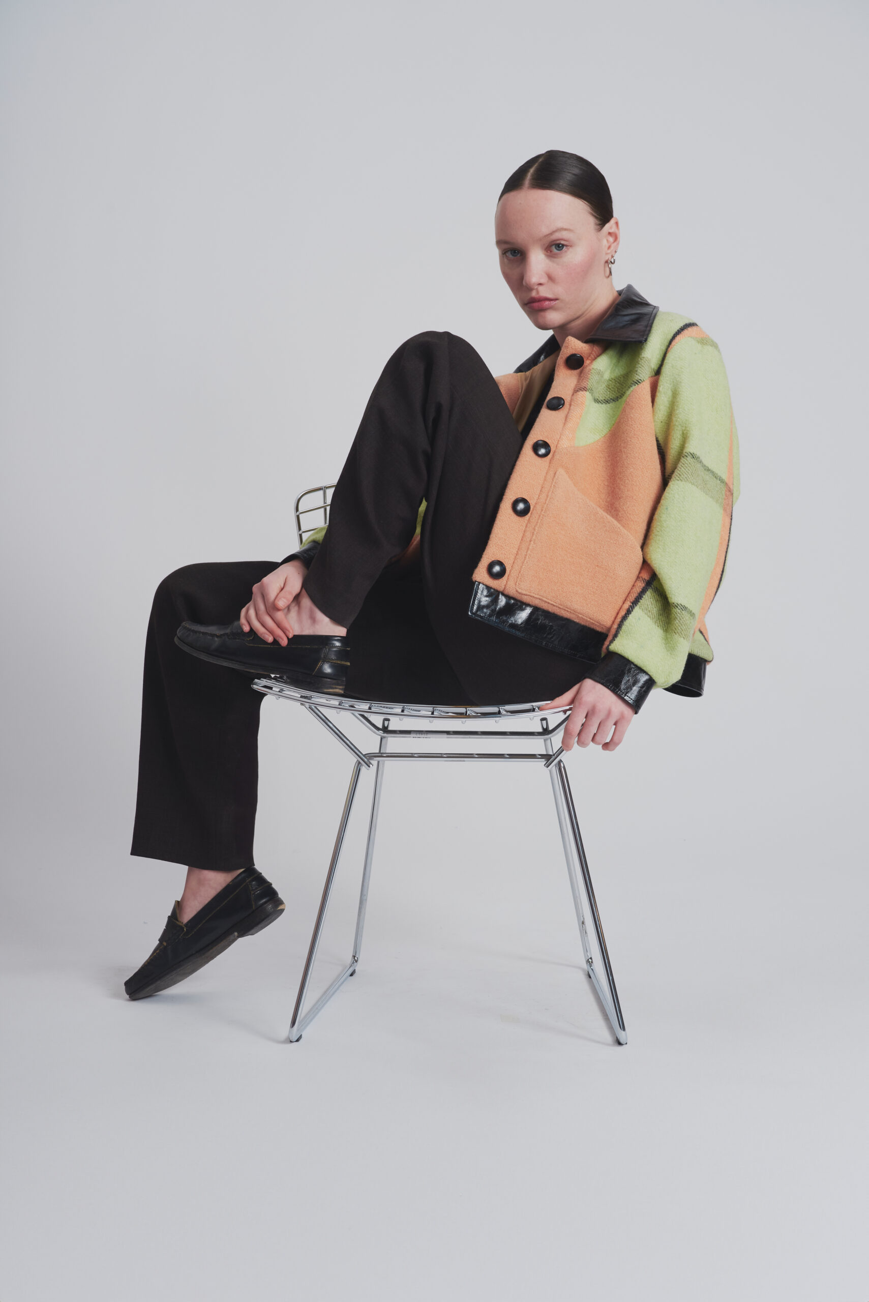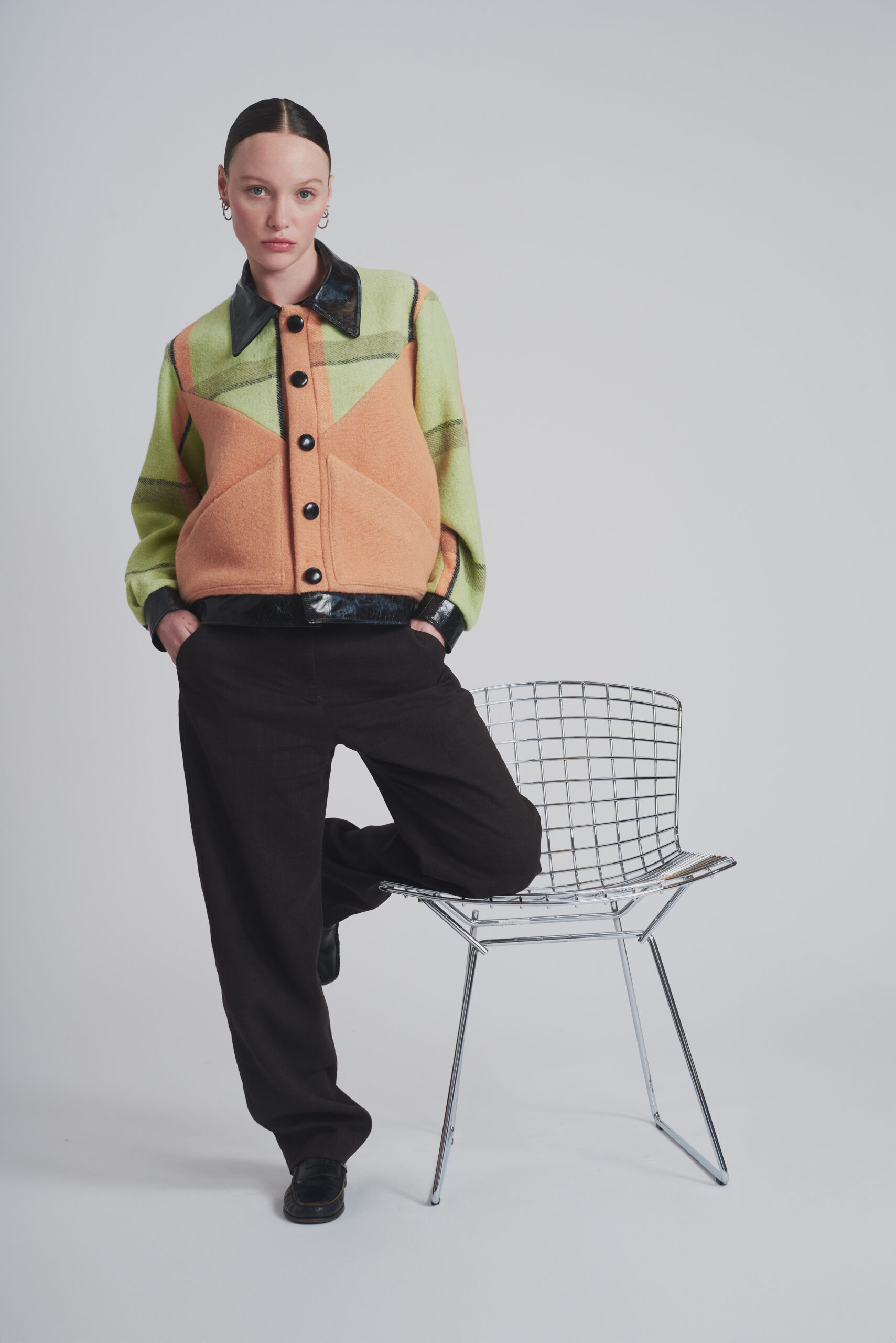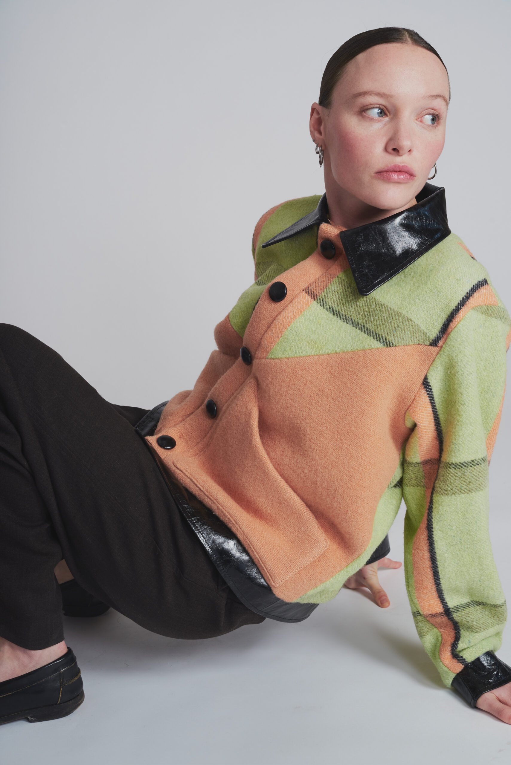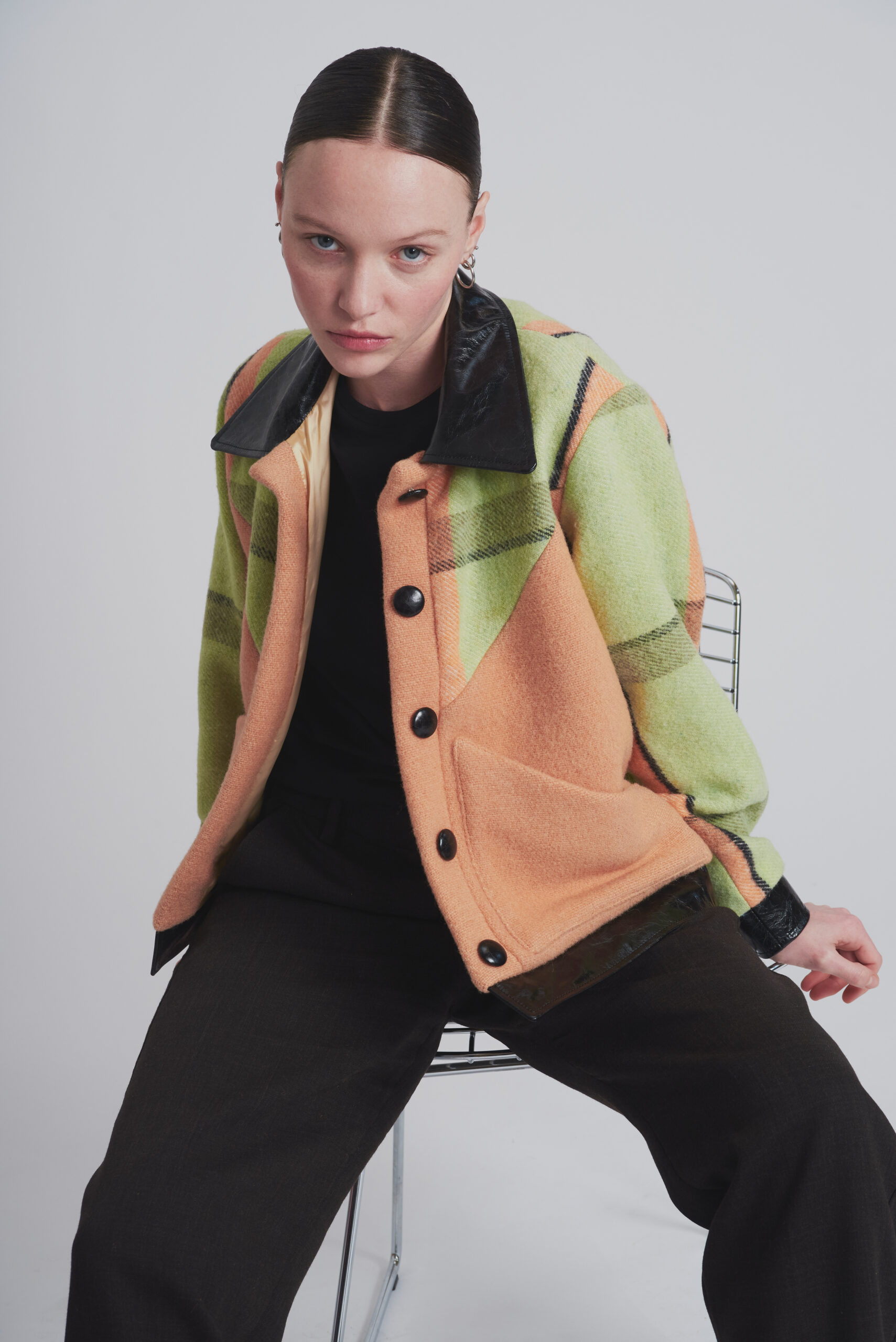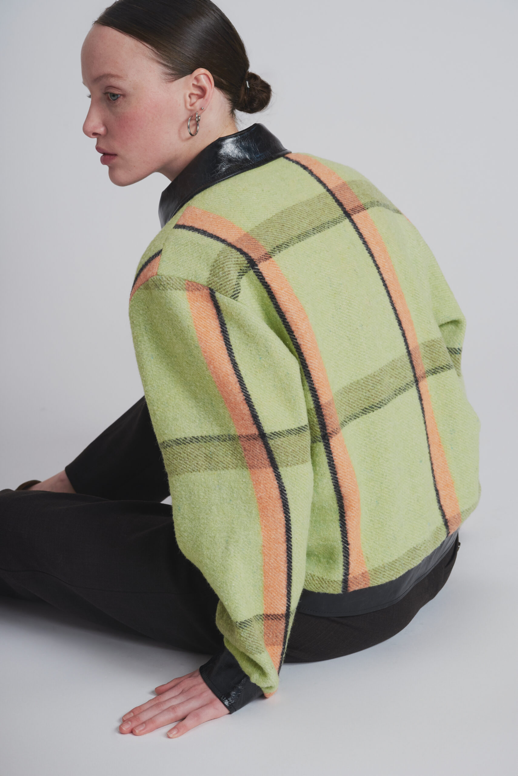 Veste en couverture chinée en France et cuir provenant de stocks dormants de grandes maisons de couture.
