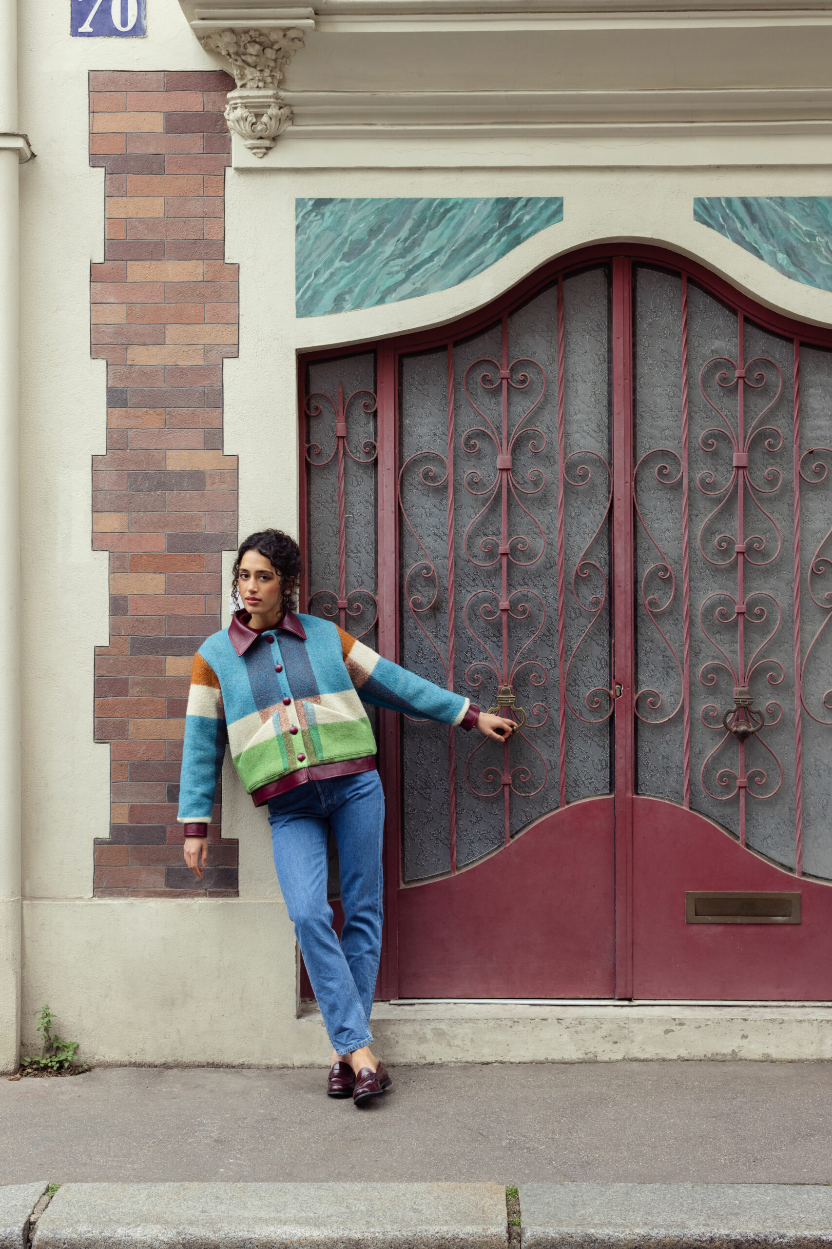 Veste en couverture chinée en France et cuir provenant de stocks dormants de grandes maisons de couture.